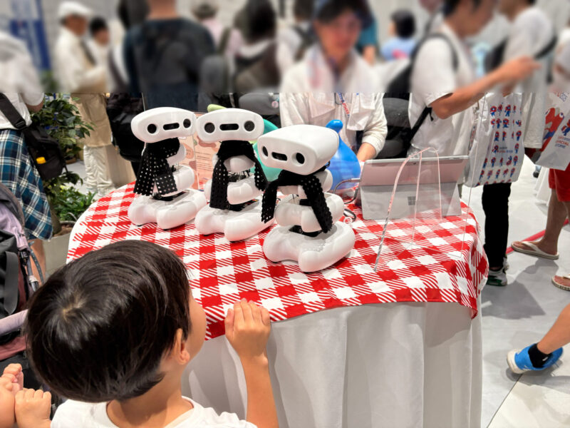腹ごしらえもすまし、今日はこれにて終了かなと帰路についていた際ふと目に留まったパビリオン。期間限定で入れ替わりの展示をされているそうですが、この日は愛知県の企業・大学の展示をされていました。「ロボットとおしゃべりできまーす!」の声に誘われて入ってみました。本当にたまたまこのタイミングだけ空いていたようです。
