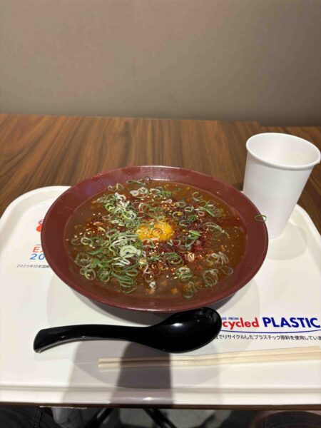 怒涛の大行列の2パビリオン攻略でやっとご飯にありつきます。マーケットプレイス東の二階にあるひよこ飯店さんの担々麺をいただきました。今まで担々麺で経験したことないあんかけ風のスープで辛味しっかり!とても美味しかったです。