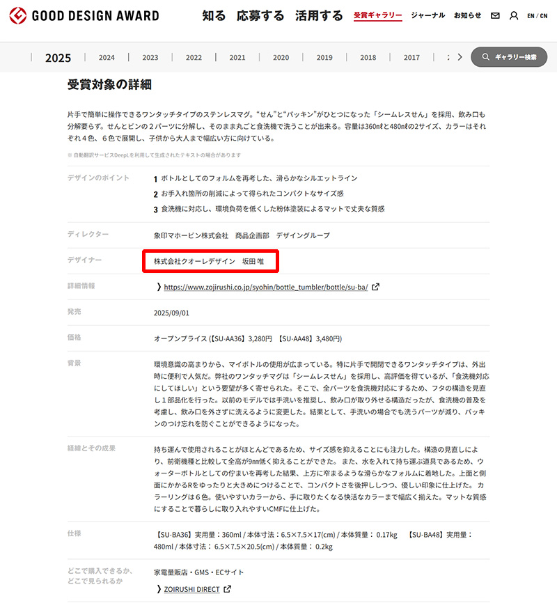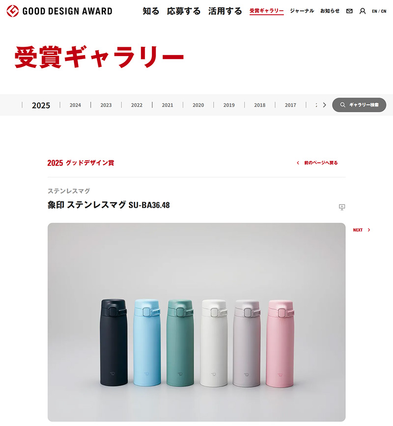 象印マホービン株式会社の商品企画部デザイングループの皆様と進めていた【ステンレスマグ】が受賞致しました。